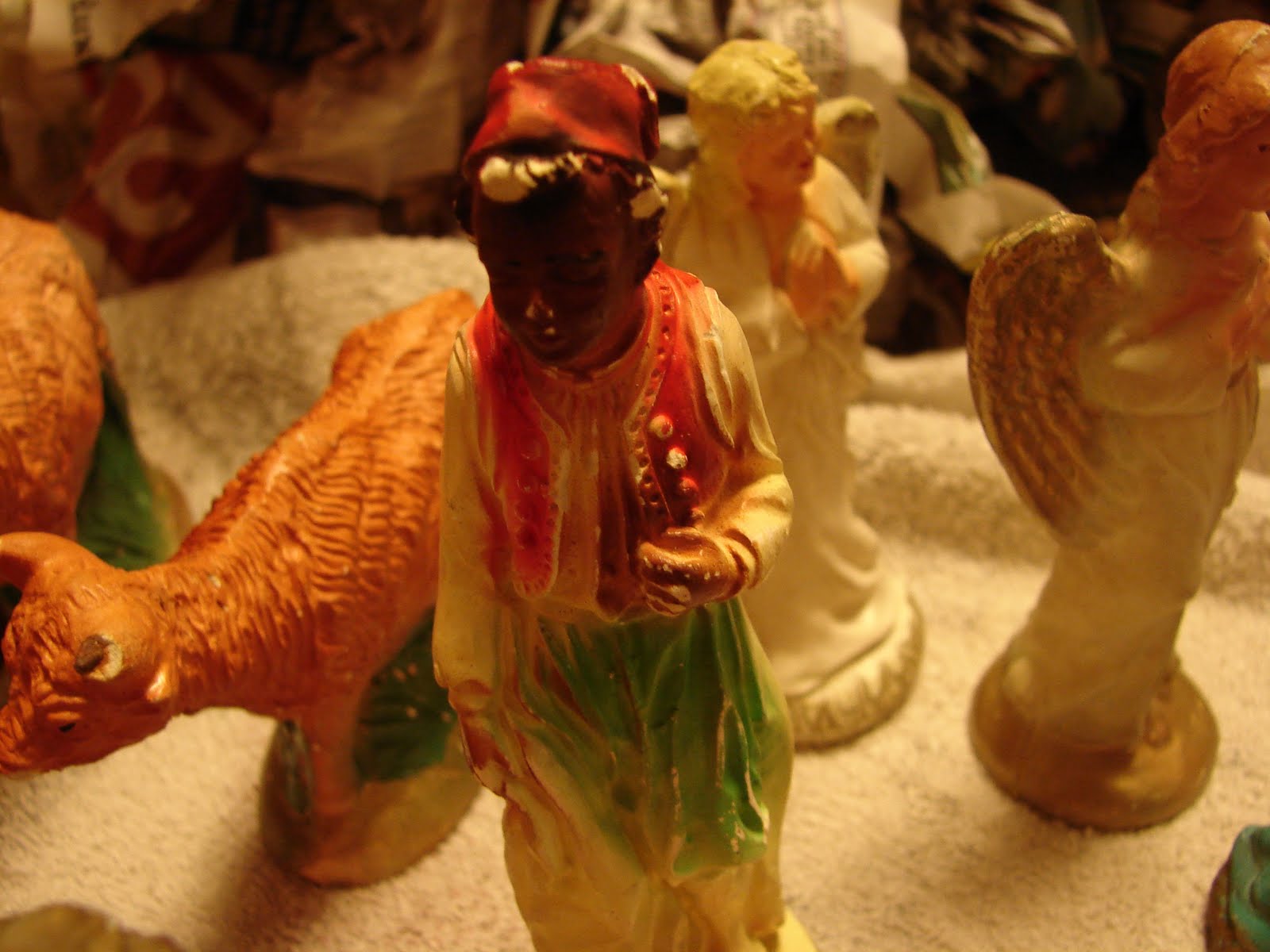 In the meantime while browsing a local used shop on a hunt for more cloth napkins for our dinner; I spotted a nativity set. I stood there for several sets of long minutes in my circling the store trying to decide if the half missing nose on one of the cows could be restored with molding clay or plaster, and if the camel with a few chips out of his ear and neck would be too noticeable once he had a fresh coat of paint. We left the store without the set. But I couldn’t get it out of my mind. For six dollars it seemed that I could at least try to restore it. So yesterday I went back and bought it. We unpacked the three wise men and each their camels, a rajah from India, three cows, and kneeling camel, a couple angels, a few shepherds, and of course, the Baby, Mary, and Joseph. The whole set is rather used, chipped, and faded, but the detail is good…the rough coats of the animals, little individual buttons and collars, and folds of the garments are all there.