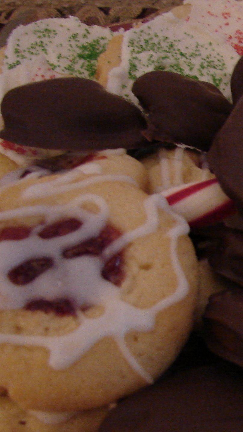 We did the traditional cookie baking here last week and the week before, too. I bought more almond bark this year than ever before. We coated peanut butter balls, coconut balls, shortbread, kringles, and pretzels. I didn’t mean to have a one track mind; just did, that’s all. Charlotte made those cookies with the jam and glaze there. She has good ideas and makes good cookies. Shortbread was hers, too. Yummy, melt-in-your-mouth.