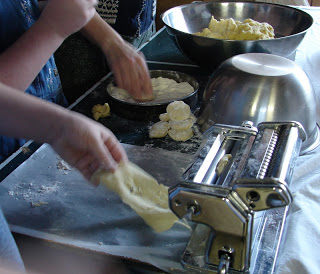 When my friend called me last week and asked me if I’d like to help make noodles; I had no idea I was going to come home with six bread bags of a finished product. When I arrived at her house yesterday morning she had a large yellow lump of dough resting in her bakery waiting to be processed into noodles.