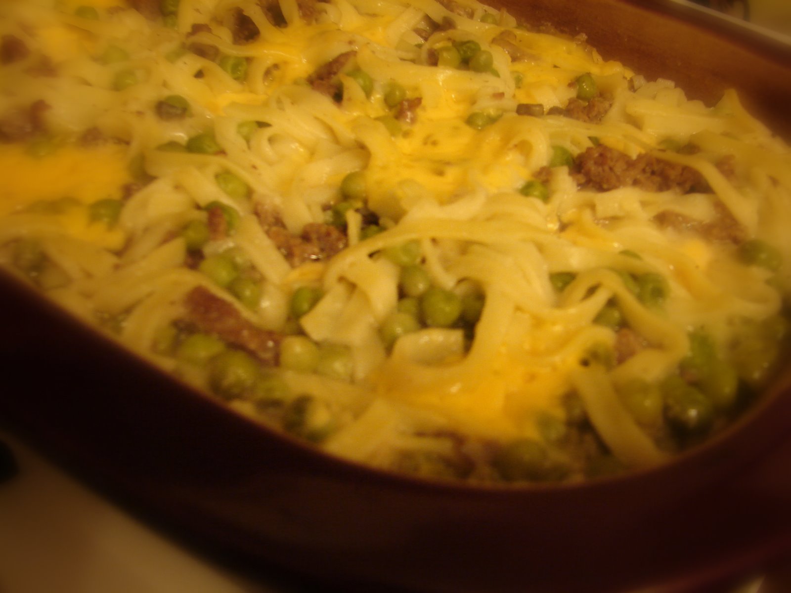 Cook noodles until done.  Brown hamburger with the onions.  Layer the hamburger, noodles, and peas in a casserole dish.  Add the soups and sour cream. Make the bread into croutons and layer on the top before baking. Or you can do what I did and add some cheese and bake covered for an hour then uncover and crumble crackers over the top, dot with butter and return to oven till brown. Serve with apple sause and fresh, warm homemade bread.