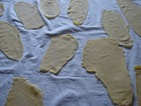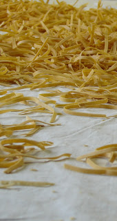 When my friend called me last week and asked me if I’d like to help make noodles; I had no idea I was going to come home with six bread bags of a finished product. When I arrived at her house yesterday morning she had a large yellow lump of dough resting in her bakery waiting to be processed into noodles.