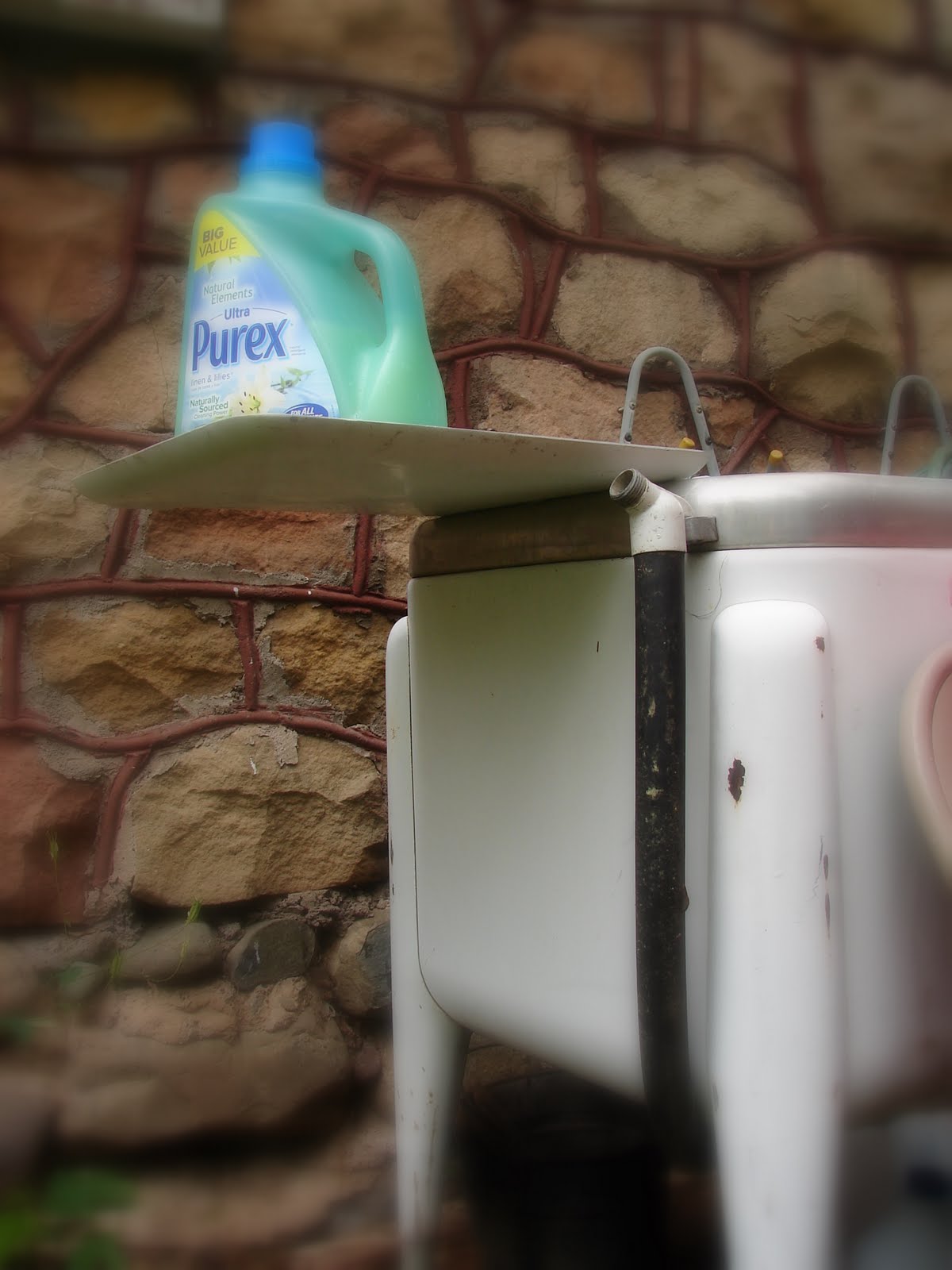 Since the fabulous front loading washer is no longer functional we have been doing the laundry outdoors with the help of this old relic. It is really quite efficient. I can get the whole huge laundry on the line and drying in about 2 1/2 hours. Working over the open washer grabbing at the socks that need turning and scrubbing a little more soap into them for whitening is enjoyable to me. After years of pulling graying whites out of the front loader and no way to make a difference; I am no longer literally locked out of controlling how long the whites stay in the washer. Someone called while I was washing the other day and hoped that I wouldn’t eventually digress to the wash board. I won’t. We are planning to replace the automatic washer, but not a front loader please.