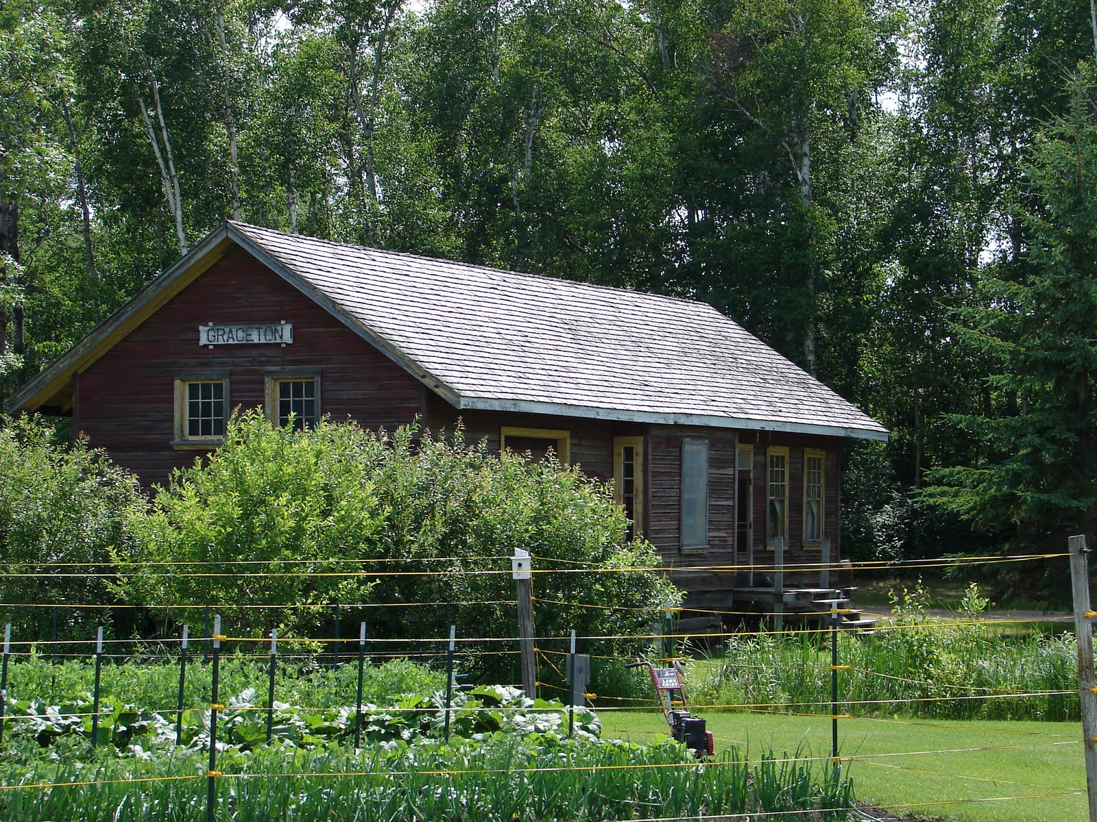 We continued our search of old places and stories and by and by we headed back to Aunt Enorans house by Lake of the Woods where we were staying. Somewhere several miles from Graceton we found our lost depot in a garden. As you can see the depot is a treasure to more than just The Aunties. A little creek (krik) runs through the yard from under the front stairs there. I suppose the creek is a man-made affair but it looks really quaint and the depot looks happy and proud nestled there in the garden. You will have to ask Carol whose yard this is. I’m sure she will know.