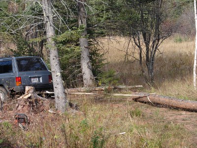 This picture is for Gabe, Elv says. Lacking a tractor to pull; Elv decided to put the Jeep to work. Thanks to our friend, Brian, who limbed the trees we had cut down that were too close to the house, we saw the potential in a spruce log. Hopefully some of them will become upright posts and cross beams in the cabin one of these days.