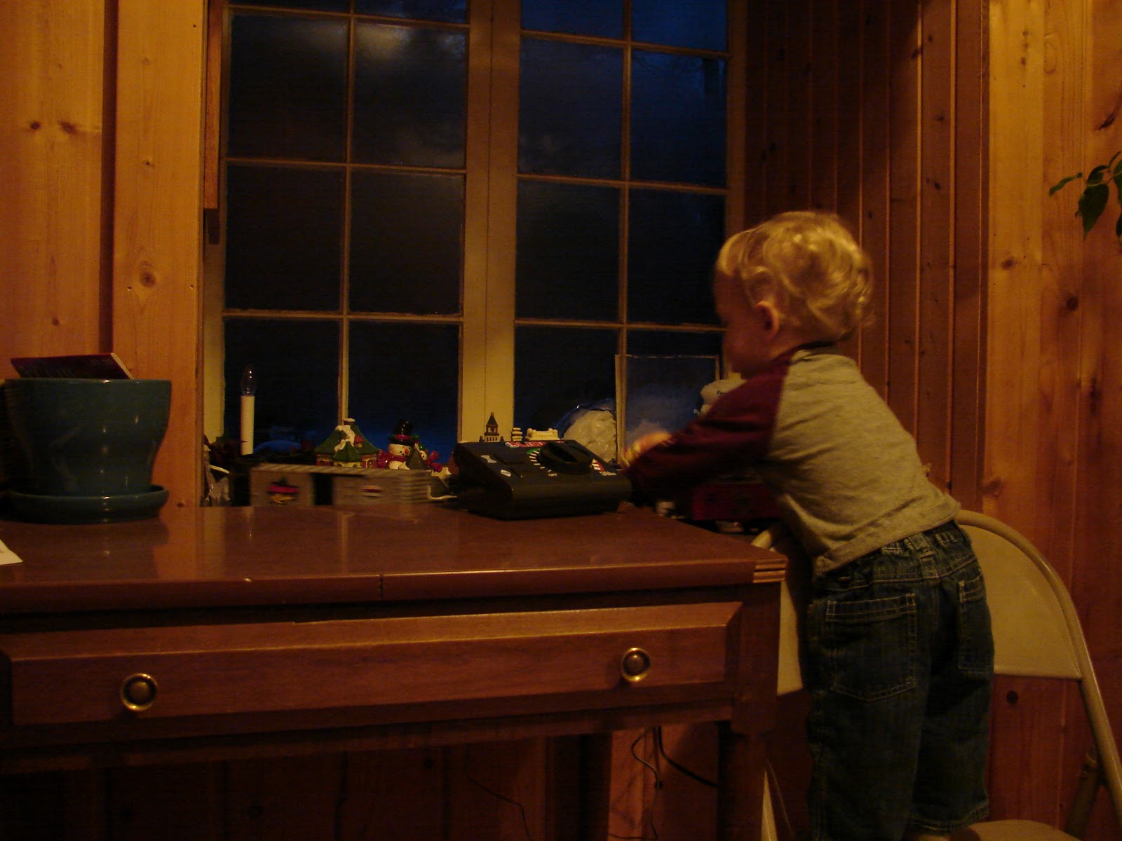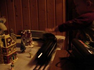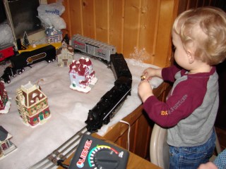 These are not good pictures at all, but they’ll have to do for now.  Benny lives in a world of doting uncles and aunts and all adults.  Last night he figured out how to turn the lever to run the little electric train.    Imagine being the midget among giants, having a vocabulary of about five words. Despite these major difficulties, Benny manages to have a place in the democracy of our family. He is totally oblivious to the facts of his age or ability.  He means to be one of us and nothing deters him. He loves and accepts us and is unable to carry a grudge for longer than two minutes. He expects the same from us.