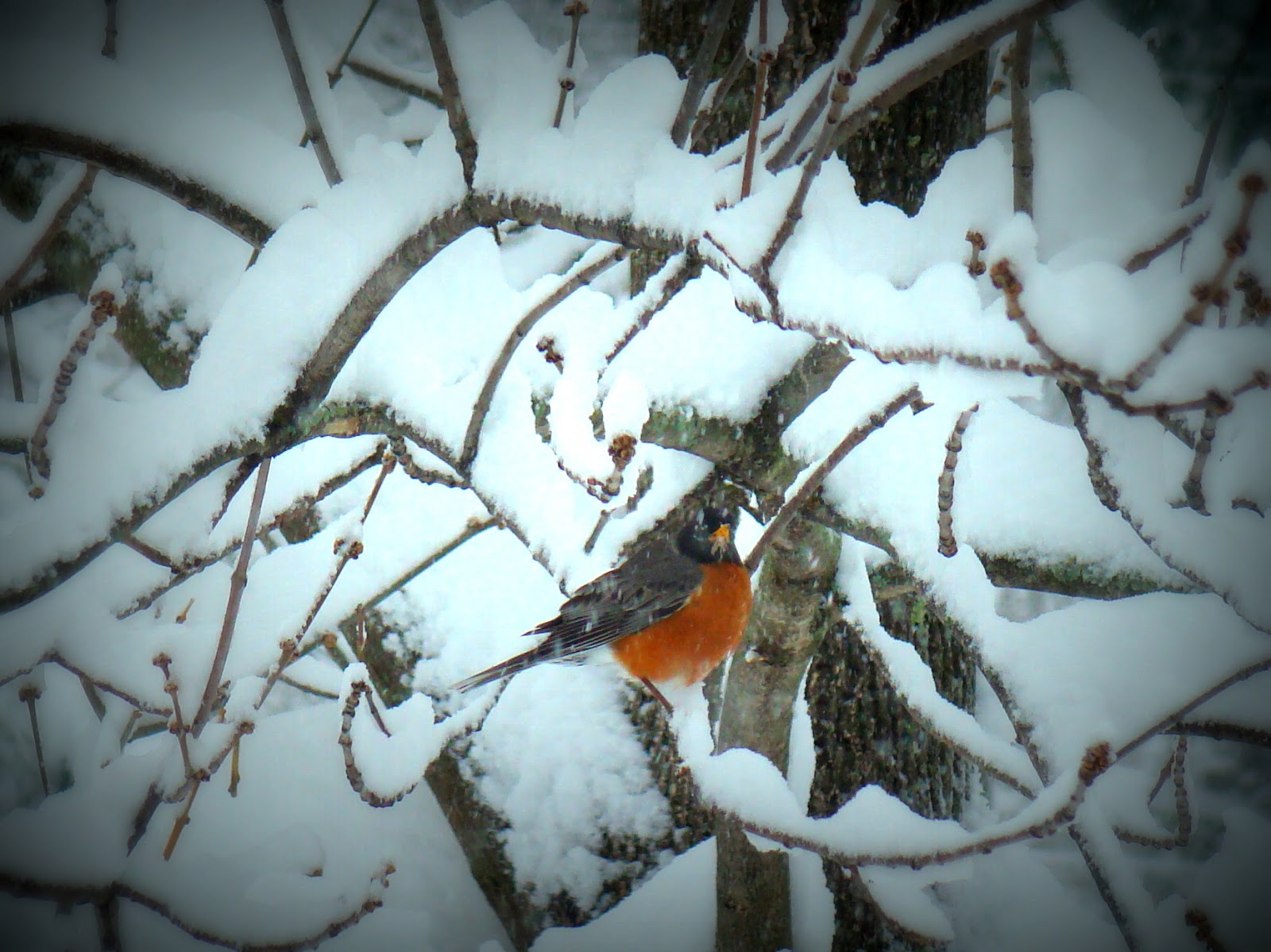 So far, we have a foot or more of snow. Yesterday afternoon when it started to snow we had bare ground, hints of green grass, happy robins, and even some flowers up. The flowers are still up, I guess, under that snow. Maybe we can have spring/summer next week.