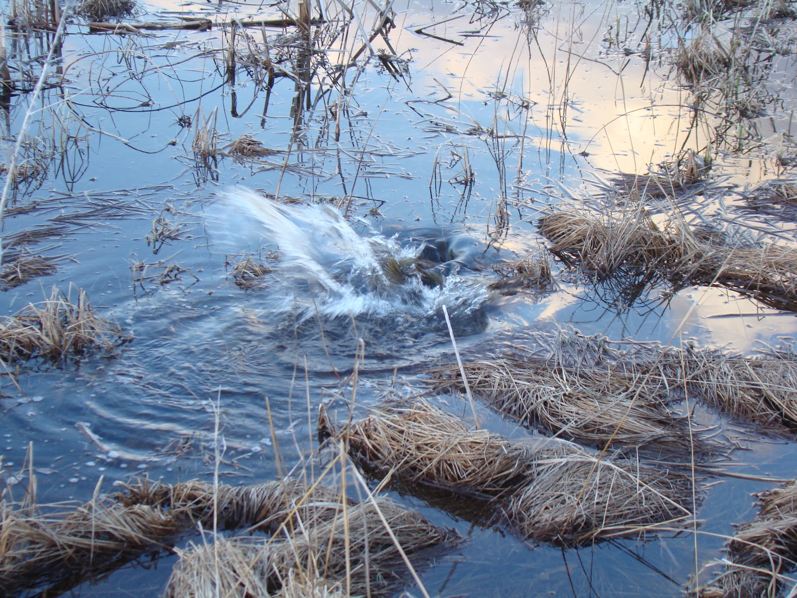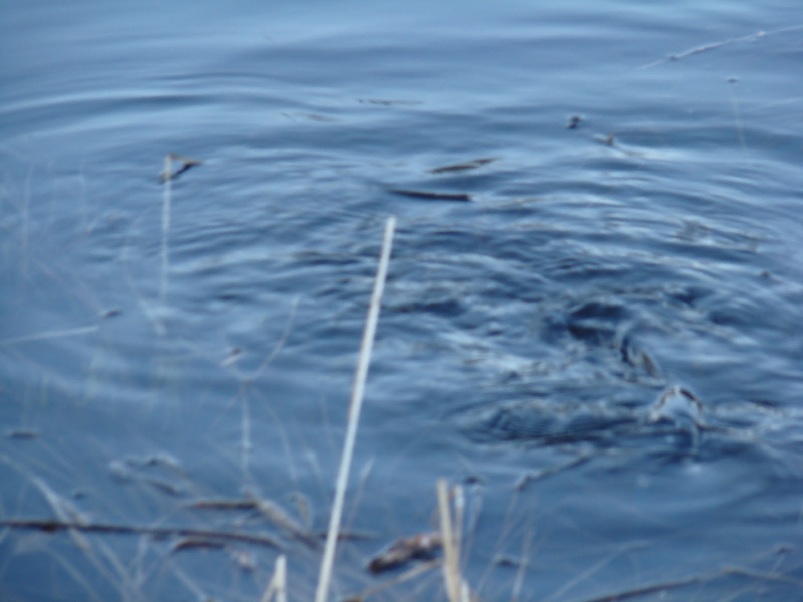 Fish were spawning near the banks of the channel. Elv thought they could have been walleye. They were coming into shallow water swimming above the grasses just under the surface, so that we could see them sticking out of the water briefly. I had never seen such a thing before. They fled with a splash when they saw us standing right there.