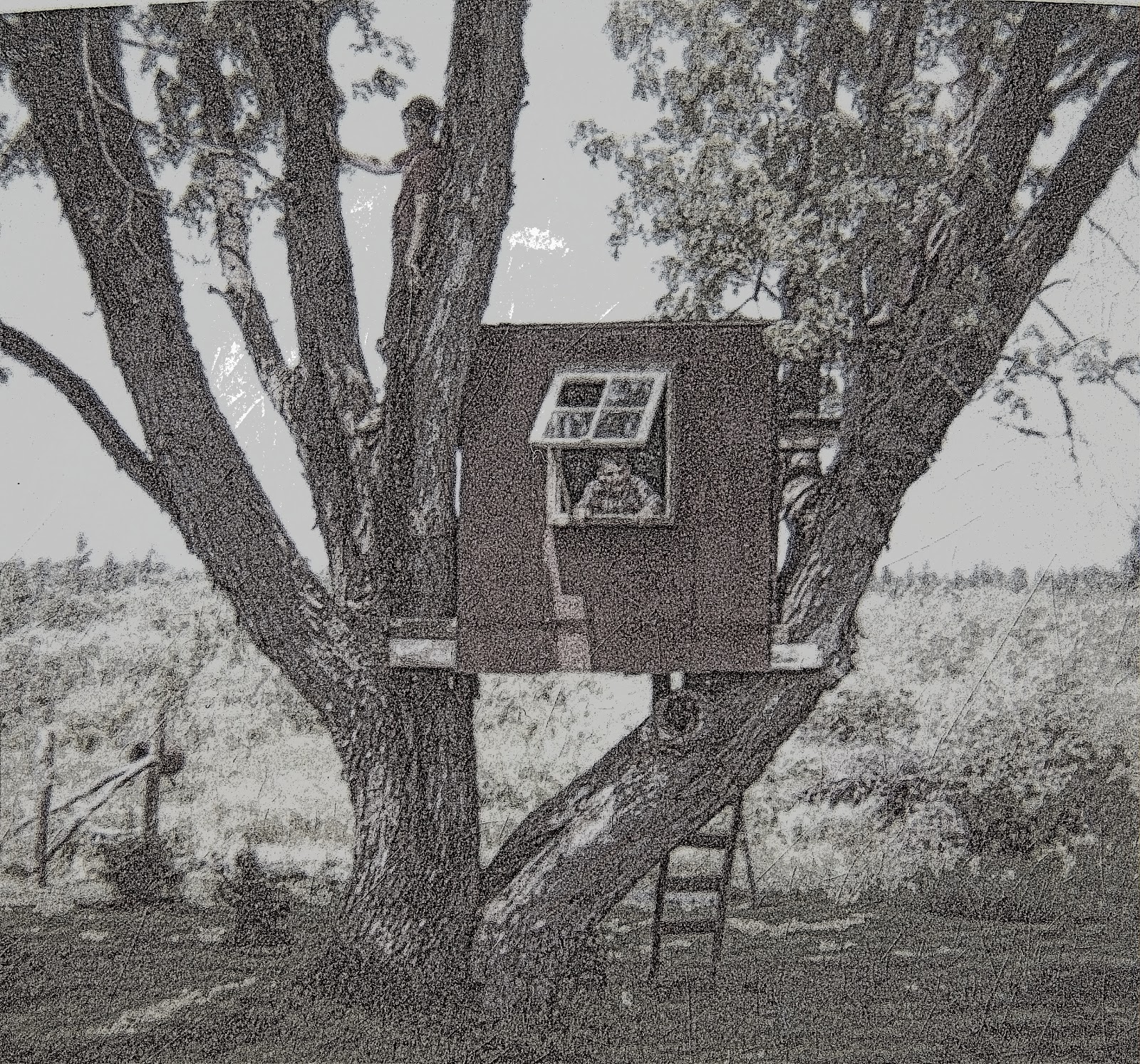Graber boys and their treehouse. I found this in Elv’s mother’s photo album last weekend. This picture conjures summer memories. There are three boys here. You’ll easily see two of them. The third is opposite the leaning boy standing in the leaves there.
