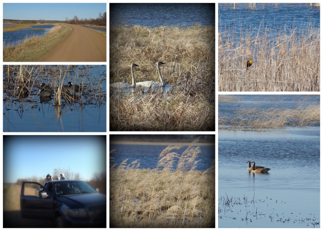 I think the family gets a little in a hurry to go over to Crex Meadows each spring. It was cold and windy again. But if we wait till the wild flowers are blooming, it is harder to see any wild life (water fowl). So it is a trade off. We listened to the cacophony of a yellow headed blackbird and got his picture to boot. There are far too many geese in Wisconsin these days. And we see swans often now…on Lake Hayward, up by Solon Springs, and at Crex Meadows. The huddle of little grey looking ducks are coots. They were trying to keep out of the wind.