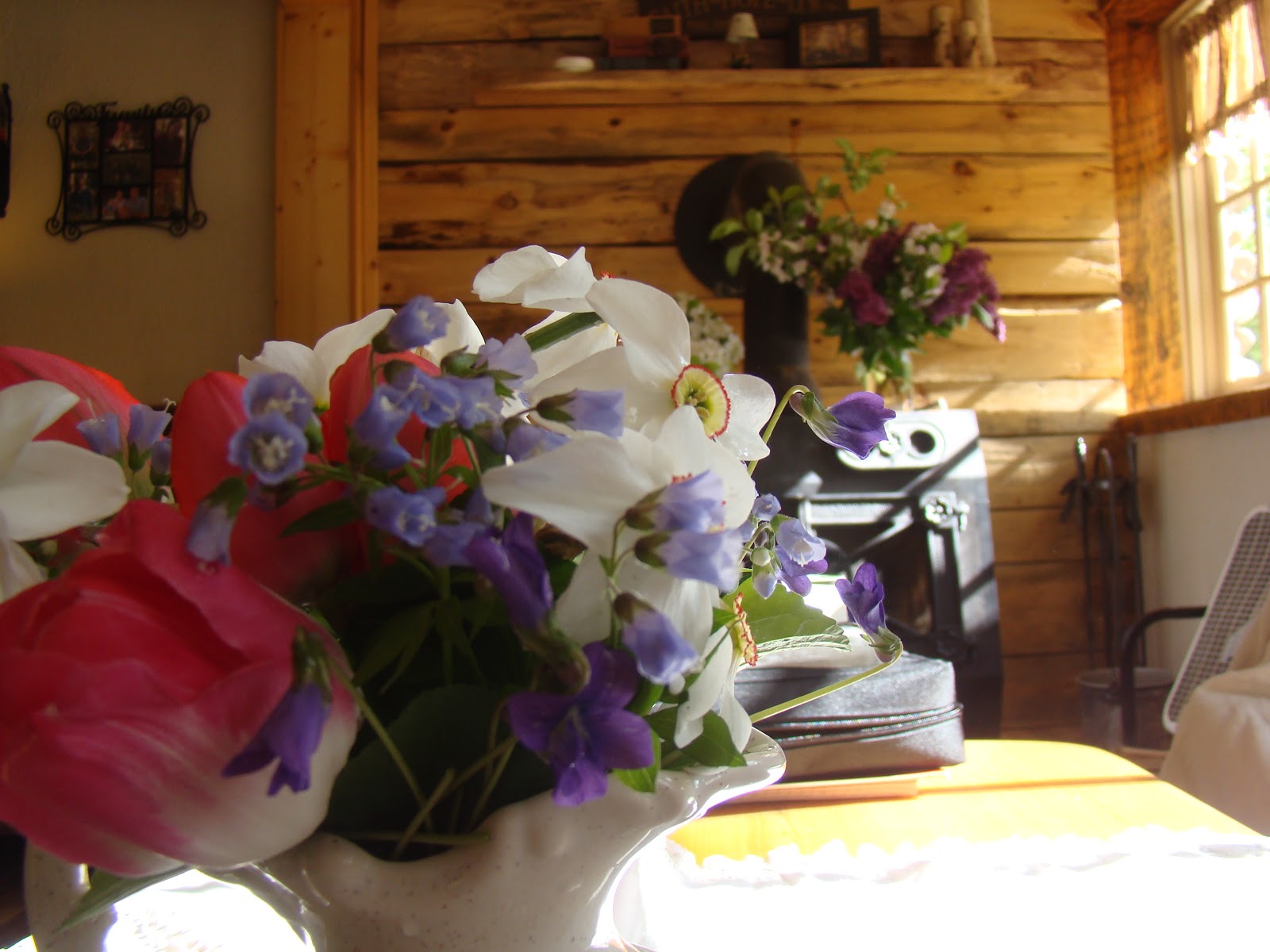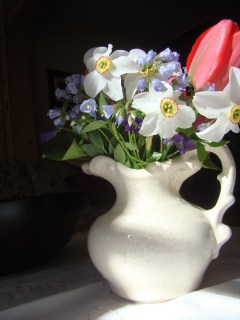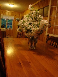 Apple blossoms. By morning the petals were dropping to decorate the table.