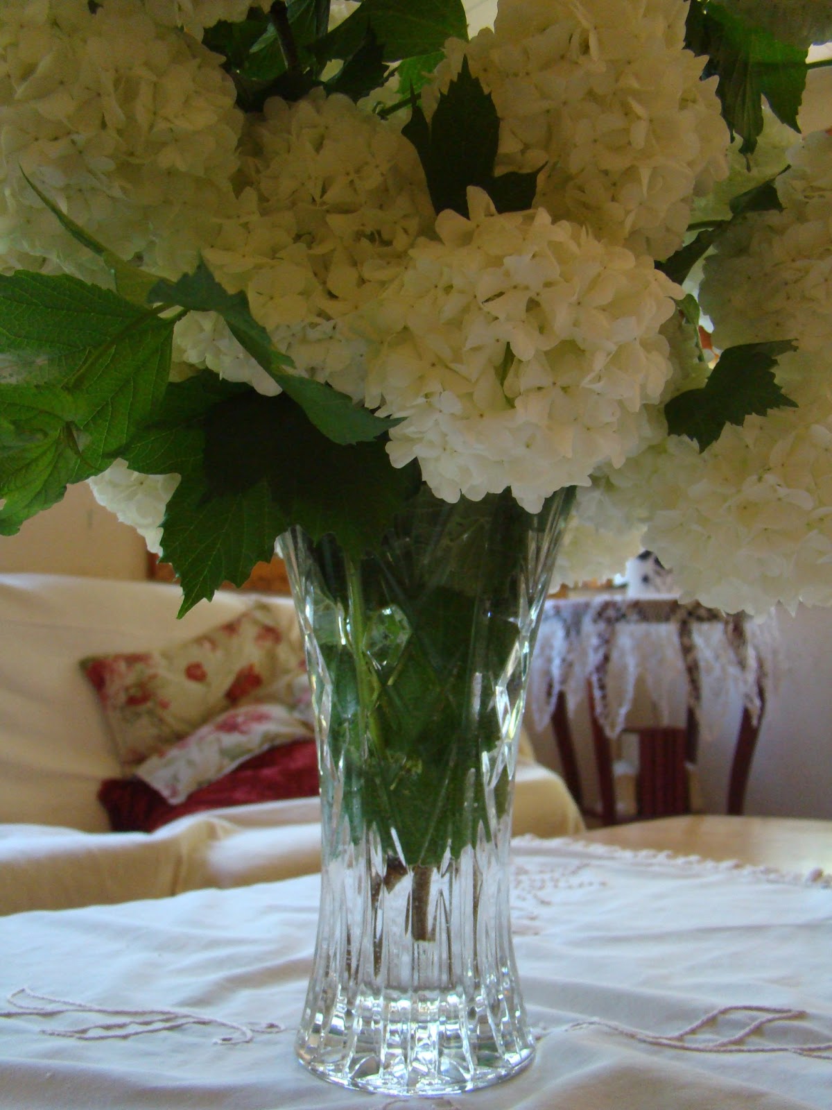Margie has a lovely snowball bush right now loaded with these beauties. I begged a bouquet and have been enjoying it on the coffee table.