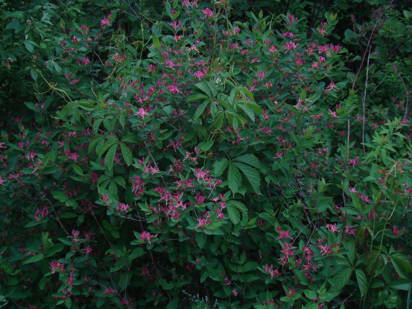 Honeysuckle thrives along the shaded road ways and there are four or five different colors of it. I like the dark pink the best and wish I had a whole solid hedge of this. There is another plant climbing in the shrubbery there, too, I know.