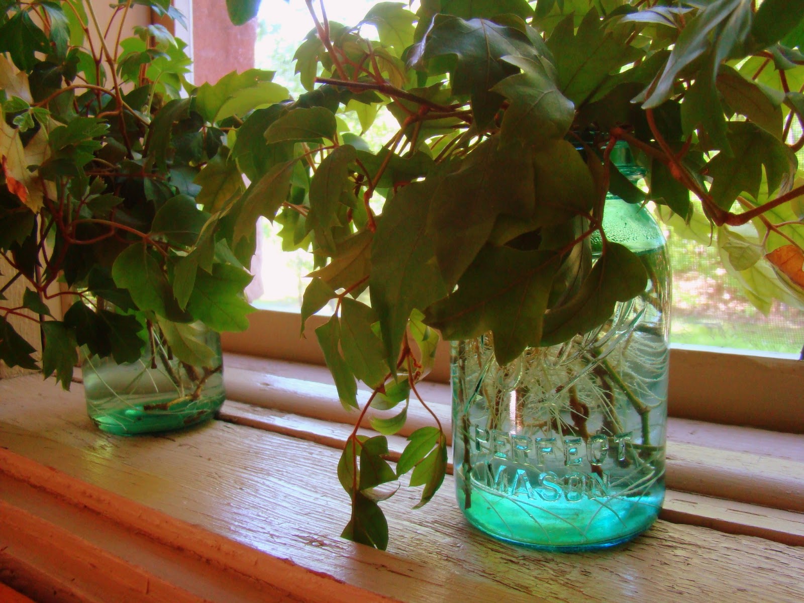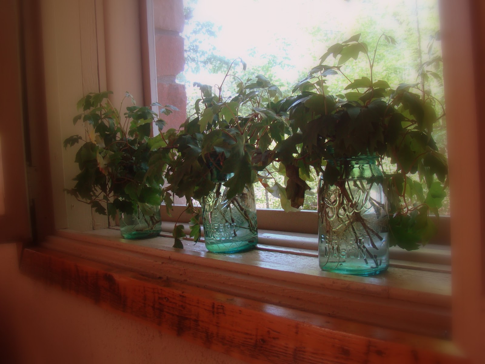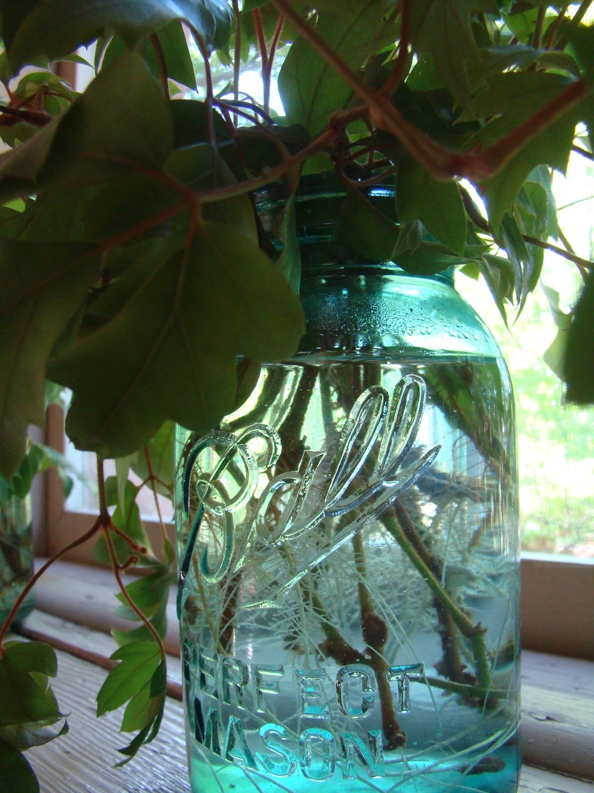 Amy gave the old root bound and beautiful hanging potted house plant a “hair cut” and couldn’t bear to throw the lovely leaves away. So we decided to root them. The blue jars make perfect vases for the project.