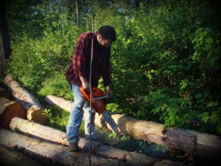 The husby cutting crookeds into sale-able lengths.