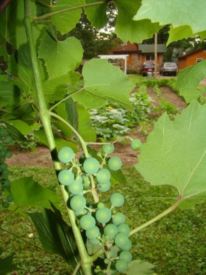 The wild grapes are yielding bountifully this year in spite of our ignoring them consistently for many years. We tried to make juice one year and a couple of times we tried jam. Failure on all the tries. These grapes are wild and sour. But this year, I can ignore them no longer. There must be bushels of fruit in the arbor: grapes and choke cherries. I am going to be good and do my research so that the