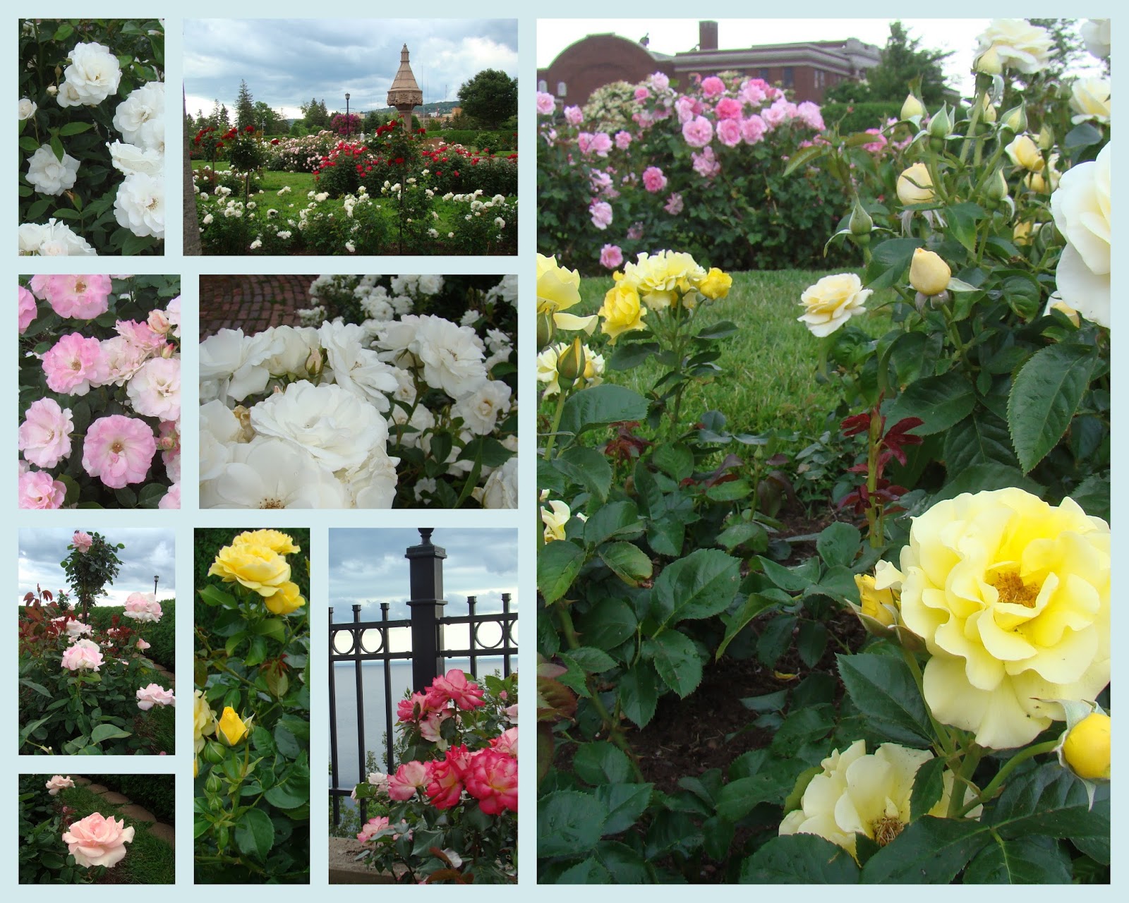 Elv and I had opportunity to be in Duluth yesterday, and we grabbed at a chance to see The Rose Garden in full bloom. Garden roses were everywhere in groupings of colors and kinds. There were mowed paths and water fountains and benches to sit and look or dream or visit as you wish. The very air was permeated with the smell of roses. I took pictures and looked my eyes out. The pictures are far from adequate.