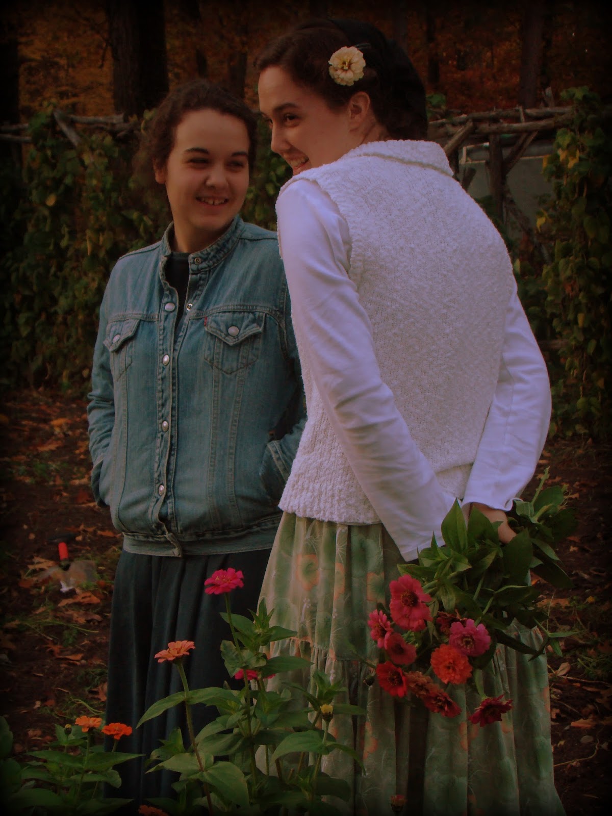 1. Pretty flowers and pretty girls, and I think the joke about raking is actually quite funny. 🙂 We have lots of leaves to rake over here if you run out there…although they are covered with snow now.