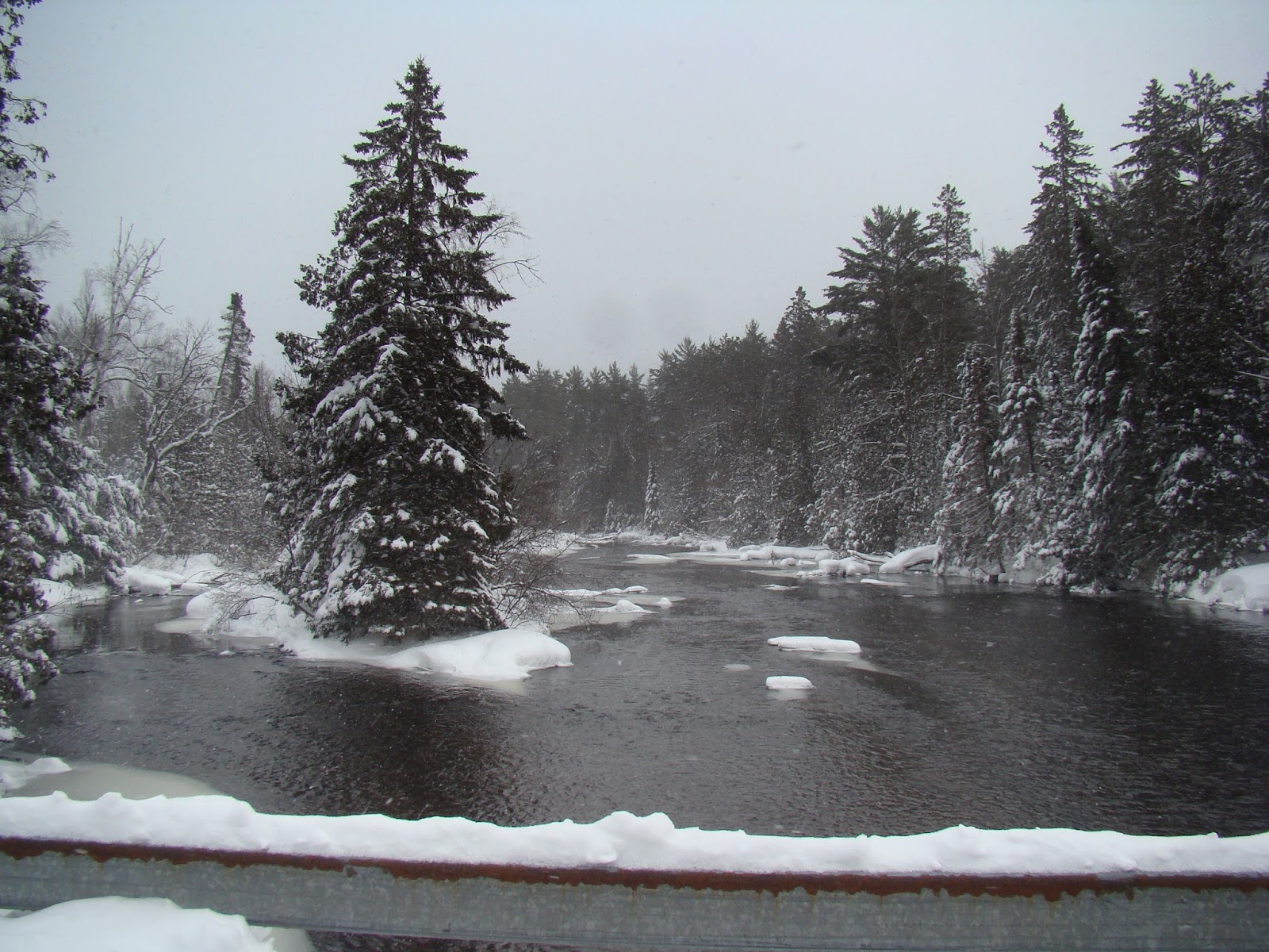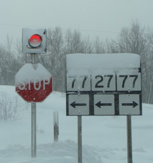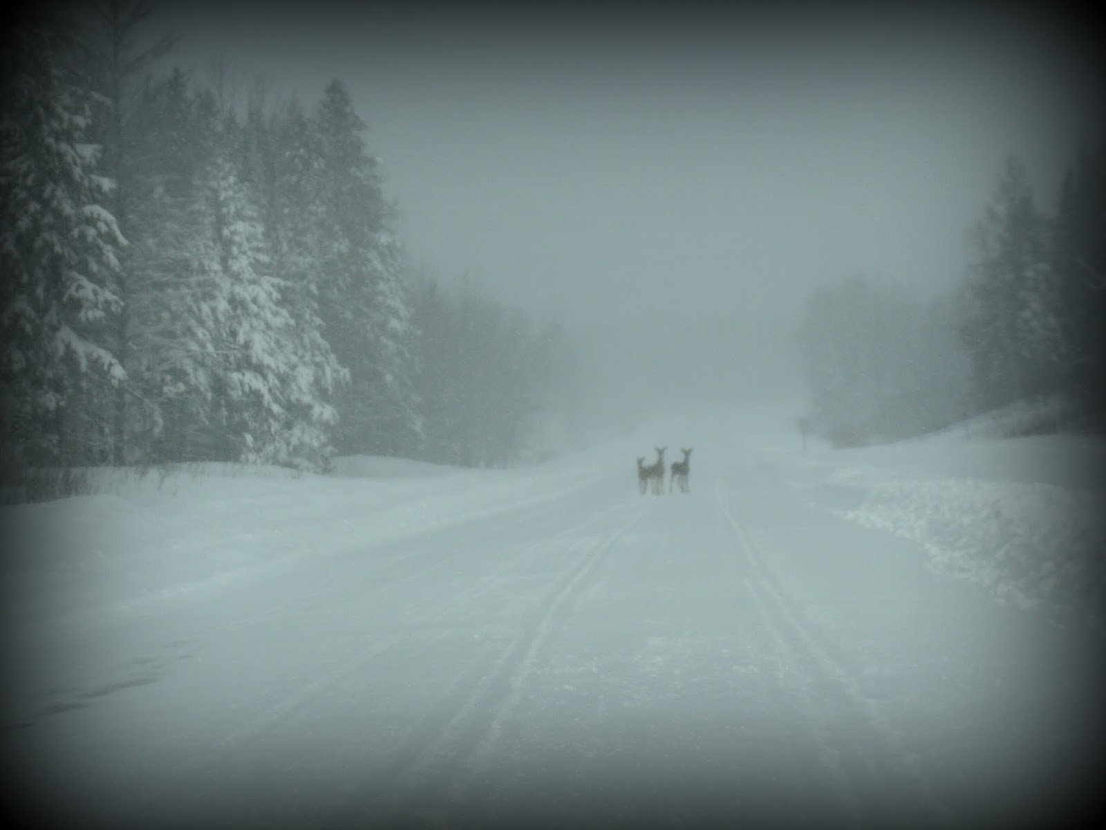 27 North of Hayward and through the blowing falling snow we saw people? or something on the road.  Whitetail deer. Three of them.  They stood there hesitantly and seemed loathe to leave the road as we came along.