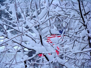 The flag flying behind snow covered branches. This is the first thing I noticed when I looked out the door at our changed world this morning.