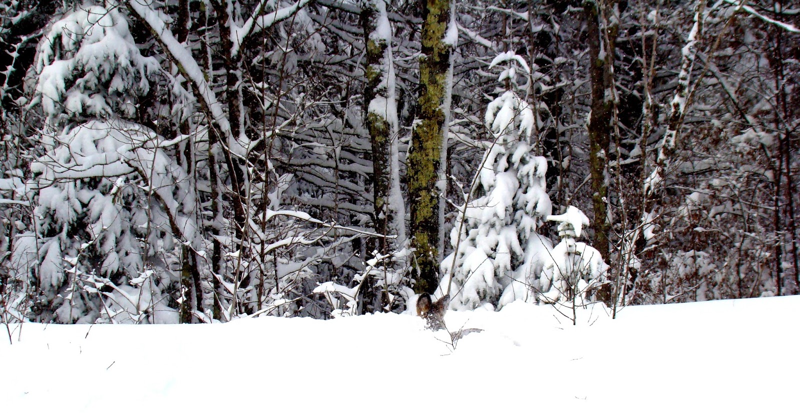 And no wonder, once they plunged for the woods we understood.  They were suddenly in the ditch struggling to get through, swimming in snow over their backs.  If you look closely at the next picture you will see one of them there just at the foot of that most obvious tree trunk. They finally broke through into the woods that wasn’t quite as deep.