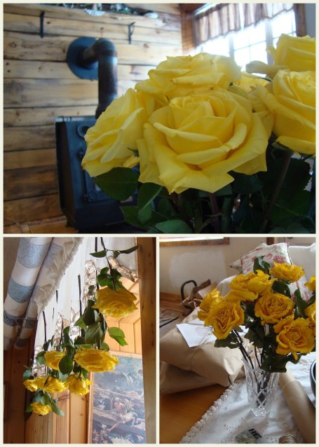 A bouquet of yellow roses goes a long way toward alleviating cabin fever when winter will not leave. I found a dozen of them pushed down into the midst of the Wal-mart carousel of fresh flowers. I claimed them knowing full well what can be done with them. Squeezing the centers told me that they were not nearly opened even though they were already partially open and fragrant. So we enjoyed them for a few days in a vase on the coffee table. Fully open they became a solid mound of sunshine for us.