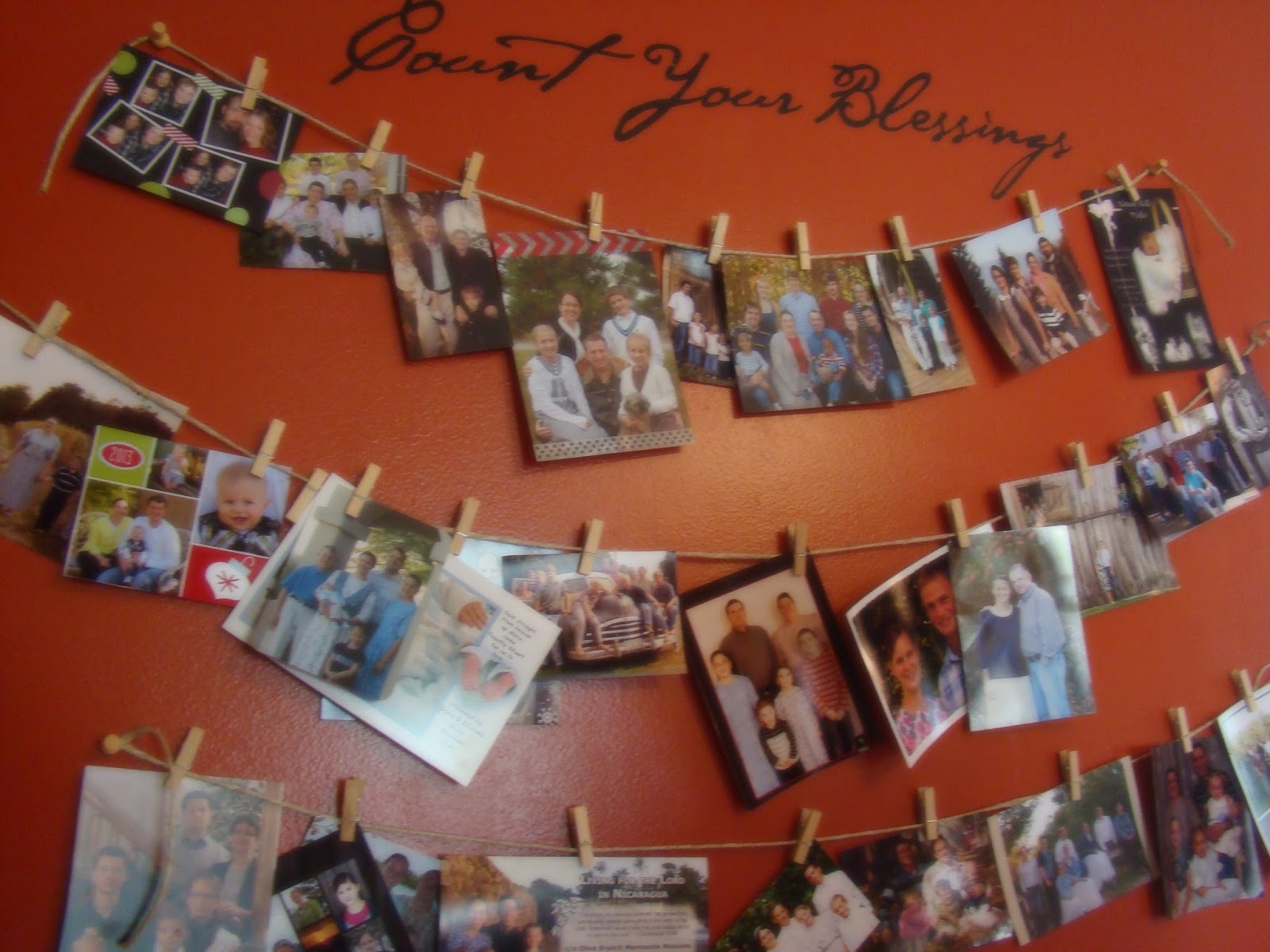 Don’t look for your picture here. I just thought is was the nicest looking arrangement of them. Just some rope and clothespins and a wall word. How simple is that!
