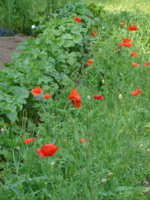 Poppies bloom in the garden. July has almost finished and the garden knows. Tomatoes are turning and the peas and radishes are gone.