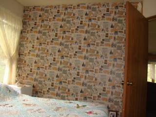 Monday, we lolly-gagged with coffee and breakfast till midmorning. Then Lance mowed the lawn, Brad did the weed-whacking, Elv installed a ceiling fan/light in the living room, Amy and I hung a wall of wallpaper in the master bedroom, and then we did up the dishes.