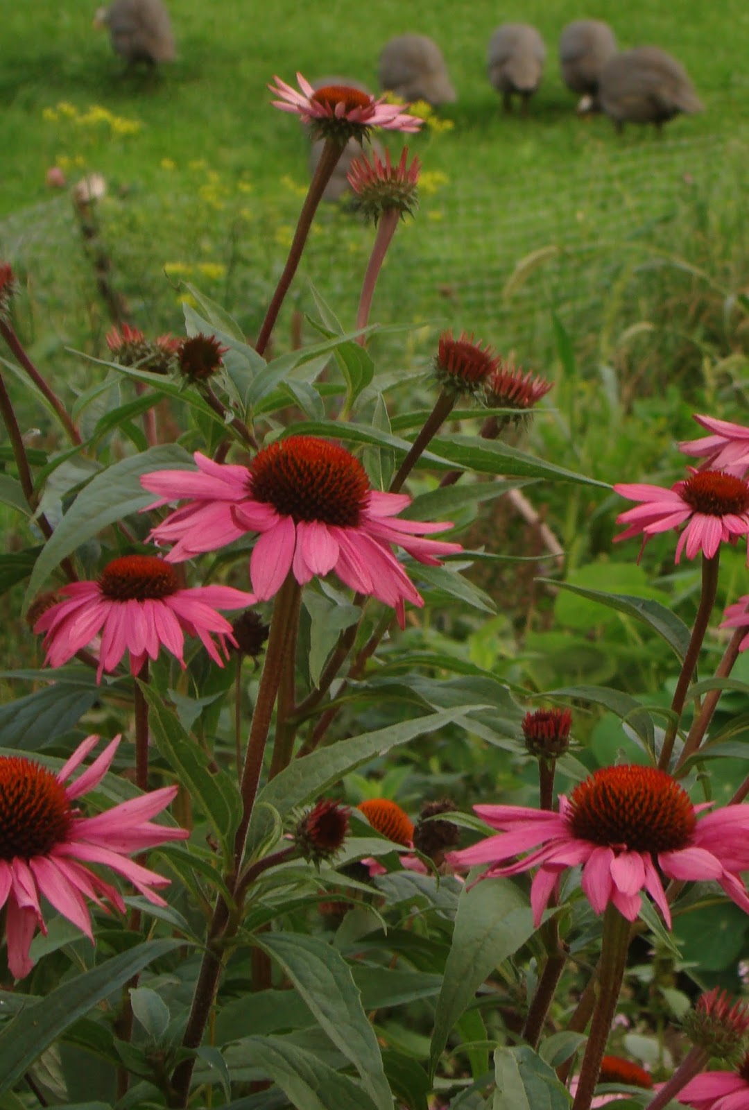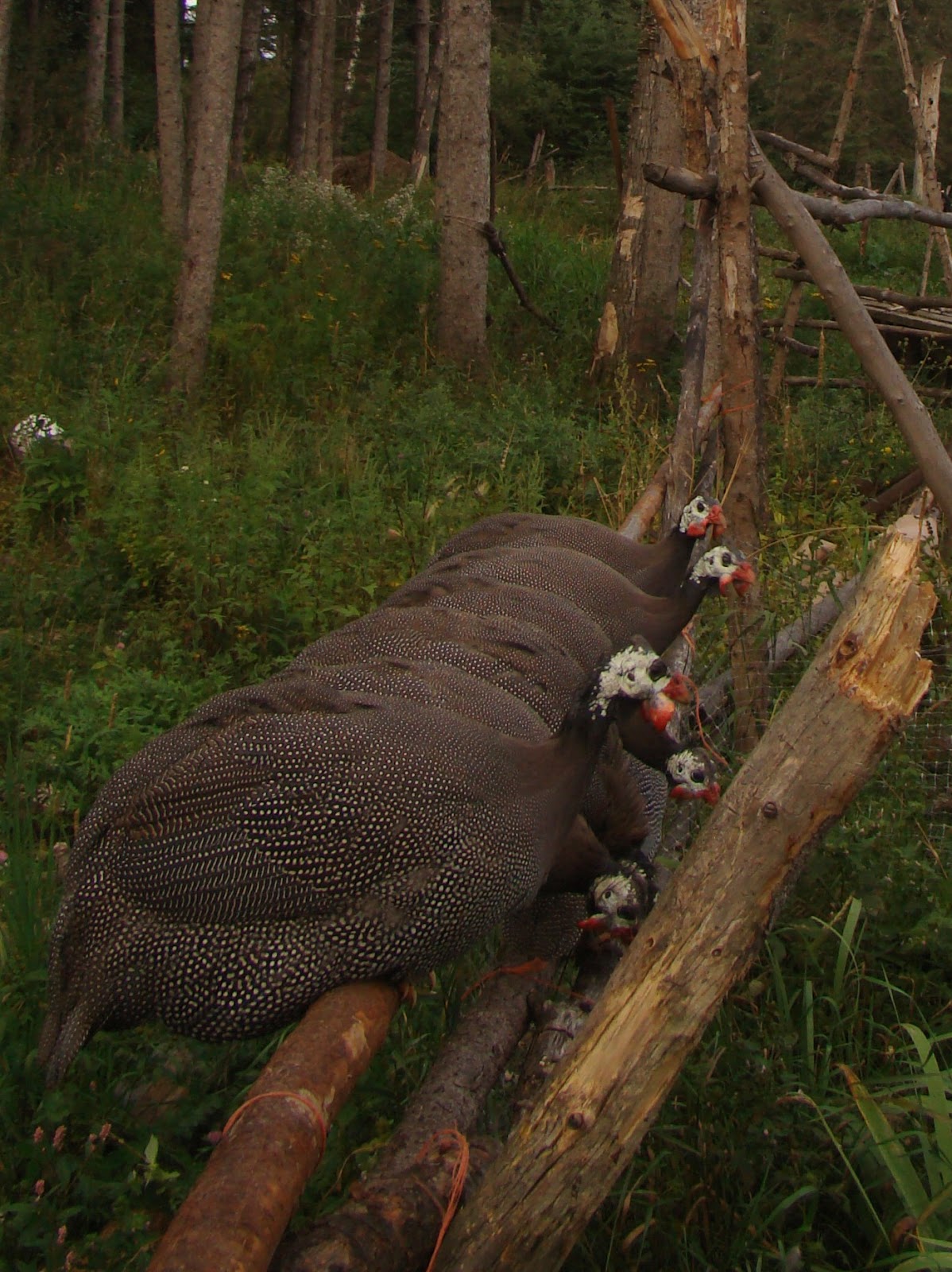 Susan has a new rasp of guineas. Watch dog, bug catcher, and homestead interest all rolled into one for you. I was out with her looking over the gardens, new apple trees and yard with the camera. The hens were all getting ready to roost for the night.