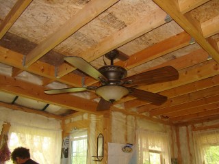 Ceiling light and fan installed on an unfinished ceiling. But it makes lovely lighting and will distribute the stove heat wonderfully come winter. And it looks funny for now, but someday…