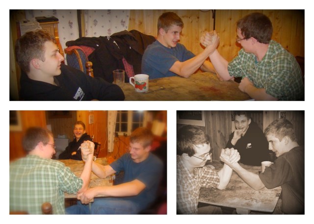 The great arm wrestling. Brad pretends to look all bored and Benny is about to nail ‘im good. Arther’s smile is priceless.