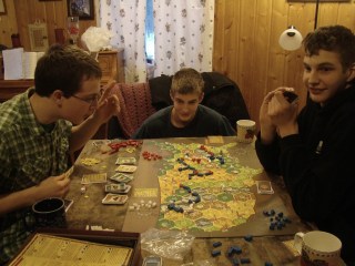 Boys in our lives. So much more than the game is here. They sat here for hours that day plodding through this game. Never mind whether they enjoyed it…they started it, so they finished it. That was the impression I got from walking by and eavesdropping. But a lot can be learned about a stranger cousin by playing a board game, you know, especially by playing Catan’s Rails and Trails game.