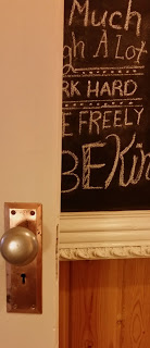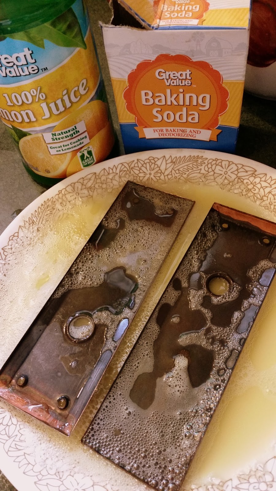 We have an old door from Grandpa Skrivseth’s house in our house. It swings between the entry and the rest of the house on hinges, no latch. It is not a pretty door, but pretty nostalgic for me. This spring we gave it a new coat of paint on the entry side and sanded and varnished it on the house side. The door knob and back panel thereof were black with age and use. Soda and lemon juice and a scrubbing did wonders. There was brass and nickel under all that black stuff.