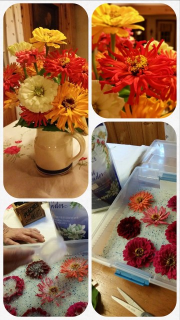 We found that the new Hobby Lobby in Rice Lake carries silica get for drying these beauties. I bought two of the largest packs to get started. I’ll be getting more, because I had only enough for two 9 by 13 containers or one layer of blooms. In my excitement in opening the first package to pour into the container, I poured too quickly and lost a handful of the perfectly round balls of it onto the table. They rolled and rolled off the table, across the floor. Sweeping them with the broom wasn’t over successful and I had to vacuum them, ultimately.