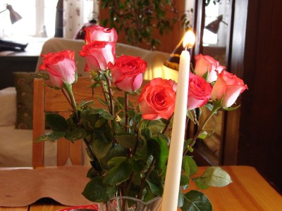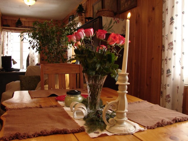 Roses from Wal-mart. When Amy and I shop together at Wal-mart for the family needs we can’t seem to walk past the flowers without seeing if there’s anything for us. The roses were in pretty good shape this time. These had firm, promising centers and the whole bunch was less than ten dollars. We brought them home and trimmed the stems so that fresh water would wick up easily to open these beauties up.