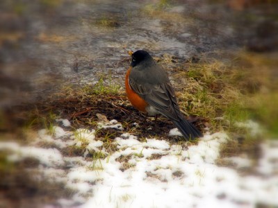 The robins showed up here in early March when we had that first exciting rush of spring. I thought they surely must have died in the snowfalls since then. It seems I was wrong. They take what comes and find worms in unlikely places like the washer drain behind the house. I have yet to hear a robin tell the world that he is not going to sit by that soapy water and wait for worms when there are God given streams in the woods nearby trickling toward the ice covered lakes.