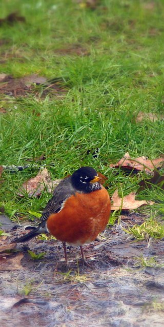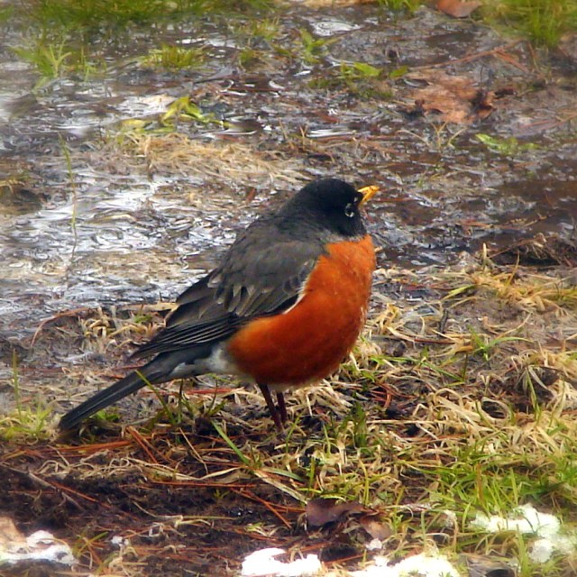 Today I noticed that the robins are waiting and listening out by the washer drain. They believe there will be worms there. Snow falls sporadically. Snow lies on the grass in places where the sun hasn’t been much yet.