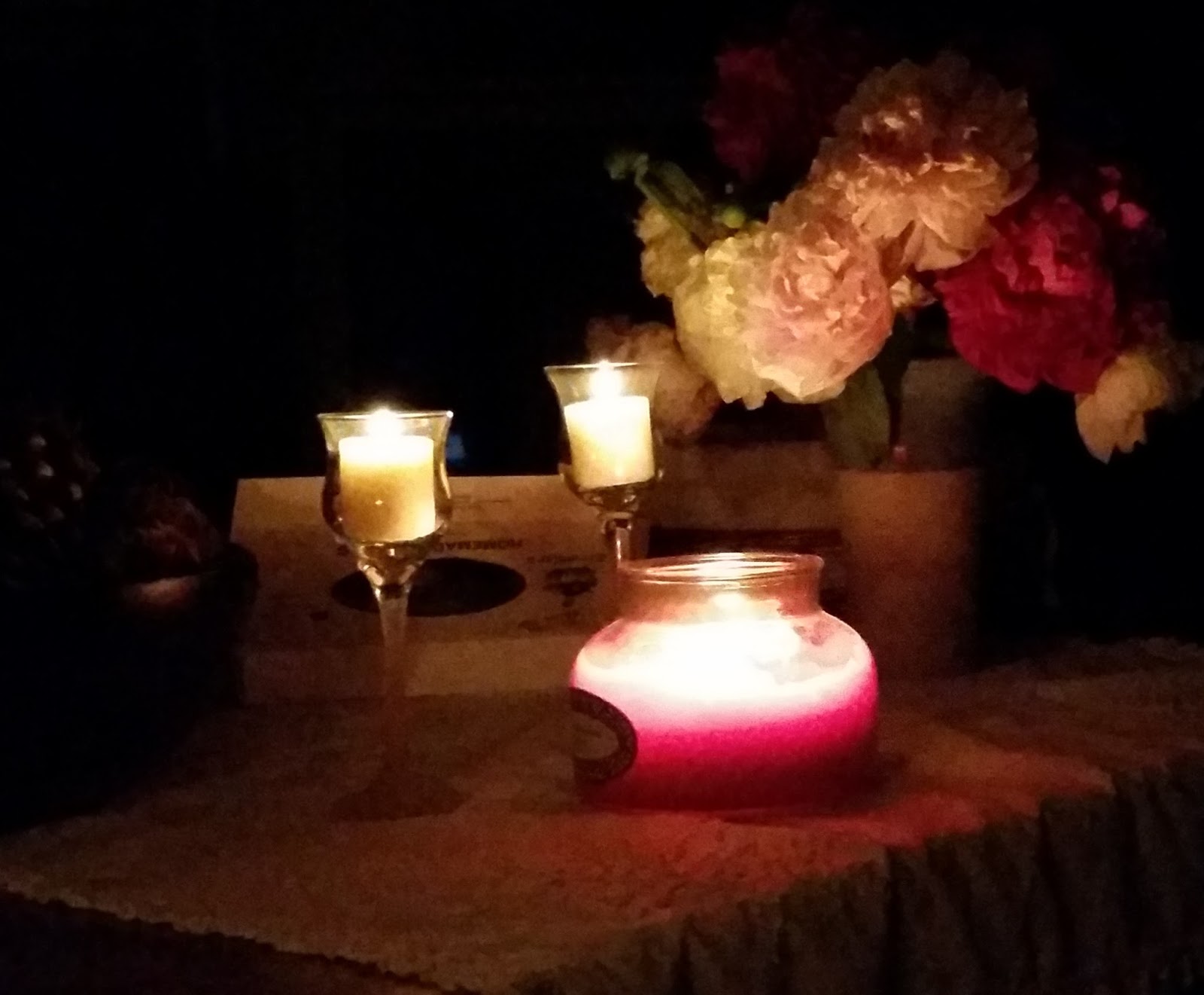 Finding lights, yes. A few of the cabin lamps would have been wonderful to have. I finally found candles. The aromatic candles in jars are not that great. Too strong smelling and not enough light to merit them. I discovered that tapers are best of all for light. If you put them in a tall vase they’re even better, because the glass and tin foil with which I stabilized the candle reflected and gave back multiple times the light. Beautiful. Welcome. Safe.