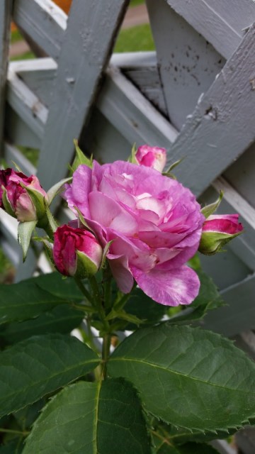 Since that has been so easy and fun, I bought another rose start from Wal-mart this spring. Now that one is blooming too, on the other side of the trellis. Pink again. But the fragrance is spicier. Lovely. It’s a statelier rose. Perhaps it require more tender respect than the other.