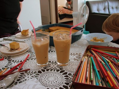 On another day we made pumpkin cheesecake which we enjoyed with our iced coffee and coloring. So we didn’t work the whole time we were there. We were treated like royalty and had time to visit for hours and enjoy the children and get plenty of naps to move beyond jet lag. And eat cheesecake and always another round of freshly pressed iced coffee as if nobody was moving to the other side of the globe in ten days at all.