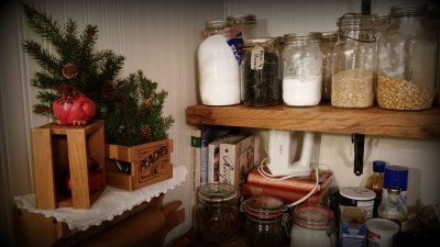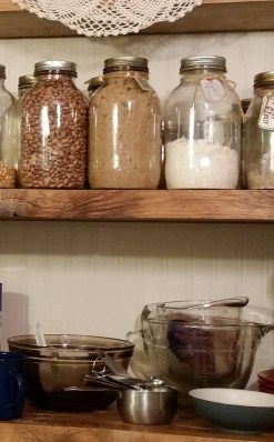 The doily you see here is an heirloom from Elv’s grandmother Graber. She used it and must have loved it. It is mended in several places, great patches of mendings, which makes it even more special to me. It is folded in half to fit the shelf. So, it is just an old doily, but it’s history, too, and part of our story. Home making should include pieces of story, “re-purposed” and treasured.