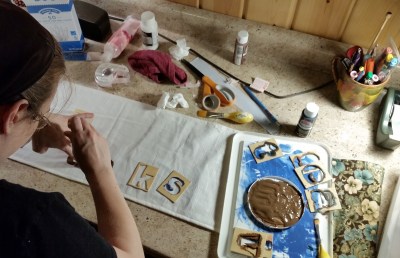 Lisl makes beautiful things with fabric and paint. She worked on this the same day that I was cleaning and re-working the pantry shelves in the kitchen.