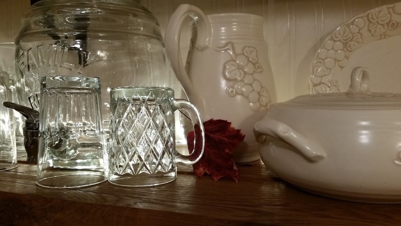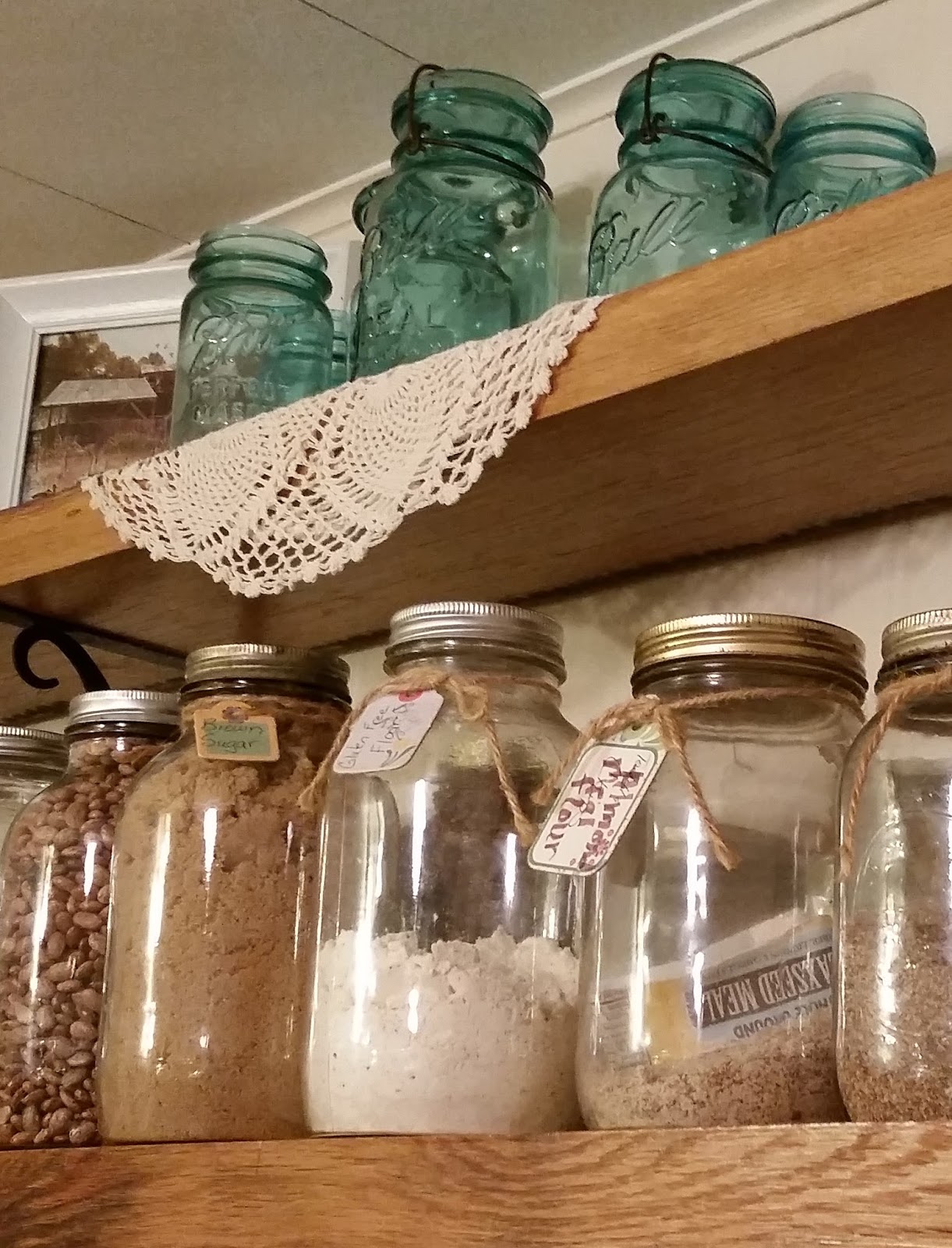 The doily you see here is an heirloom from Elv’s grandmother Graber. She used it and must have loved it. It is mended in several places, great patches of mendings, which makes it even more special to me. It is folded in half to fit the shelf. So, it is just an old doily, but it’s history, too, and part of our story. Home making should include pieces of story, “re-purposed” and treasured.