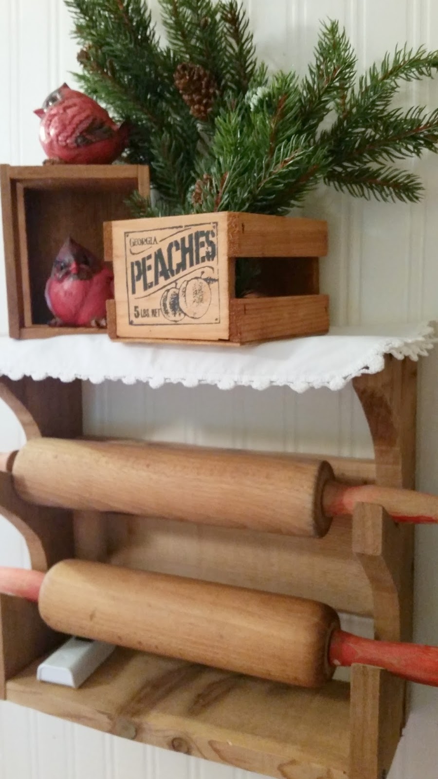The fat cardinals came down from the window shelf in the dining room where they had collected a coat of dust to be washed and rejuvenated with some new pine picks from where I work. This is a fun and inexpensive way to decorate in the kitchen.