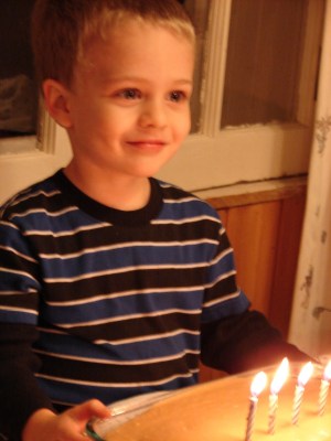 Asher turned four midst the hub-bub of fall events and home-comings and travel.  Charlotte didn’t forget and brought a cake and candles along when we were all together one evening and we took time to sing Happy Birthday and take a picture.