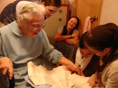 We found old quilts, old lacy pillow cases and kerchiefs. Mom remembers that the quilt made of one inch squares came from her mother’s mother even though she can’t remember the newest great grandbaby’s name nor yet to which granddaughter he belongs.
