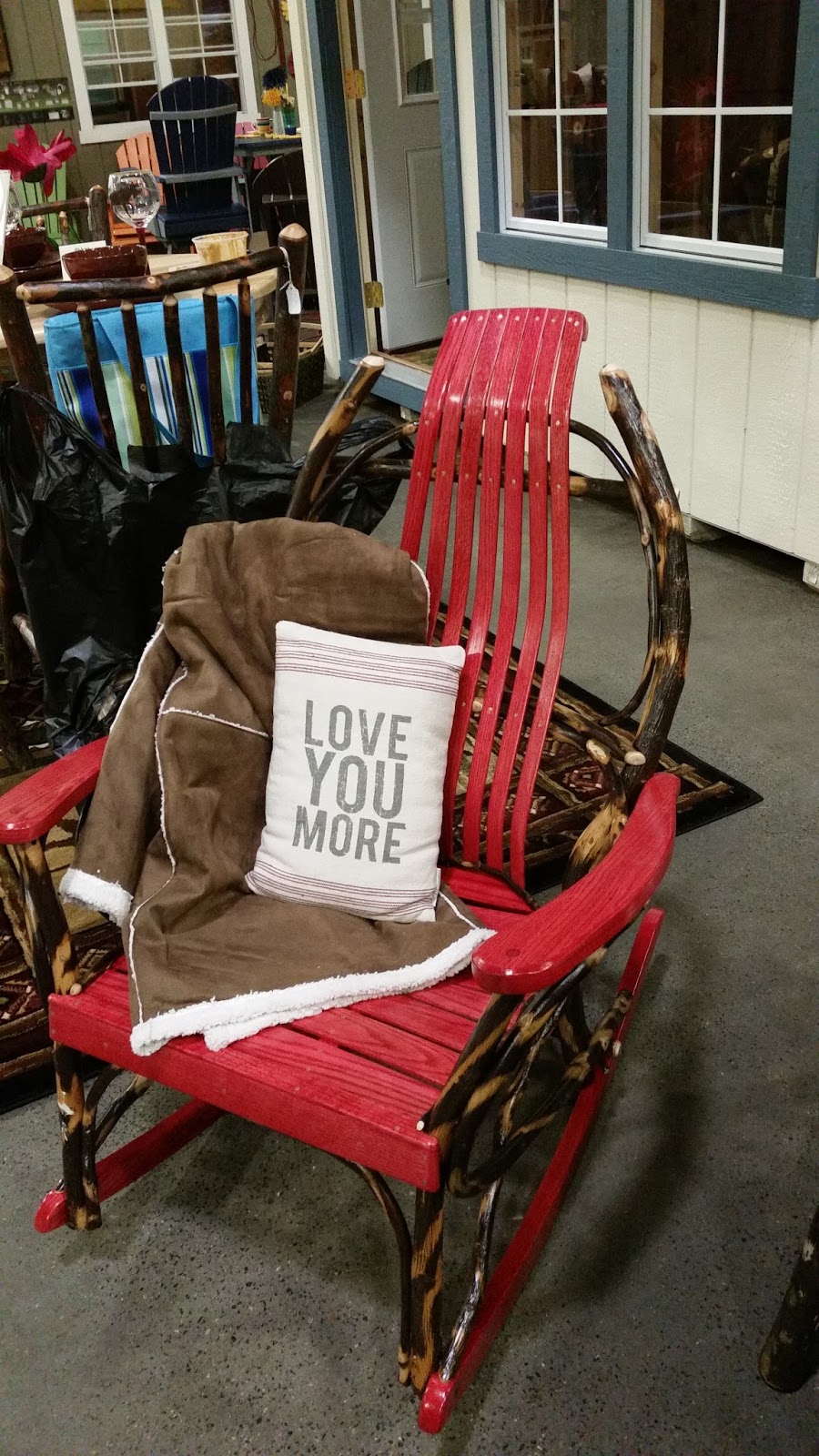 This pink, hickory rocker is kind of cute. It is stained so the grain still shows nicely. Everybody but me said, “That’s ugly!” when it came off the truck. But I could see it cozy-ed up to a huge stone fireplace on a braided rug under old, low-slung beams darkened with the smoke of a thousand wood fires. Sure enough, it sold at the show and we’re going to order more. The next one will be a darker red. Come in to Northwood Outdoor soon and order yours.