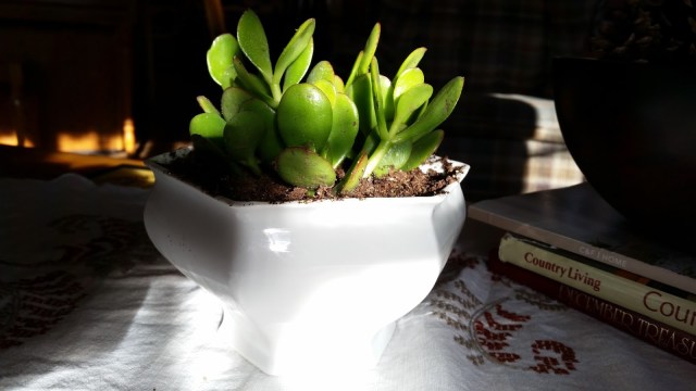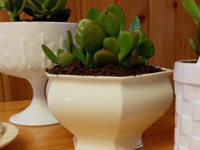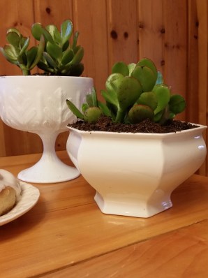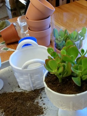I wanted to do this project a month ago, but Wal-Mart had no succulents for sale then. Yesterday, finally. And what fun. The clay pots are nice too, but we already had the white glass planned, thus.