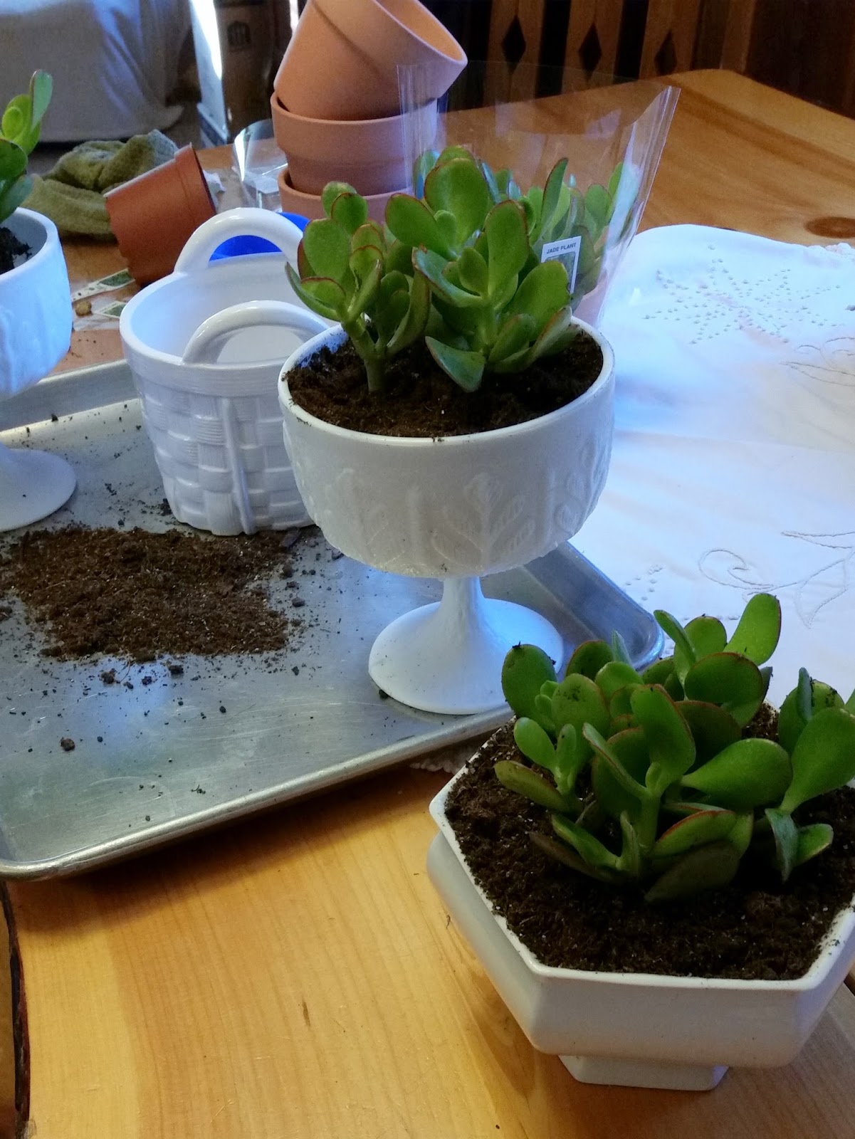 I wanted to do this project a month ago, but Wal-Mart had no succulents for sale then. Yesterday, finally. And what fun. The clay pots are nice too, but we already had the white glass planned, thus.