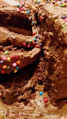On the other hand, Jenny’s humiliation from her Angel Food flop was short-lived having created a three layered chocolate, albeit boxed, cake for Myles, who was feverish and tired last night at cake serving time. He didn’t eat any then, but that didn’t stop the rest of us from enjoying it. This is one of those times when I think I get the better part of food. I can’t have it but I can enjoy it with my camera, and share the picture, and hone my writing craft describing it for you. Anybody hungry for moist chocolate cake? When Amy cut the cake and took out the first wedge the next few wedges kept their shape but gently unfolded, leaning into the serving spatula to be lifted onto a plate, moist and soft, still definitely cake but not a bit powdery. They ate it with vanilla ice cream.
